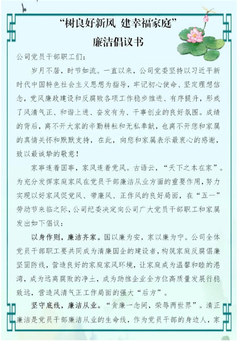 集團(tuán)公司把家風(fēng)建設(shè)作為廉潔文化建設(shè)的重要一環(huán),結(jié)合文明家庭創(chuàng)建,開展家庭助廉教育,以家風(fēng)促作風(fēng),以親情促廉情。