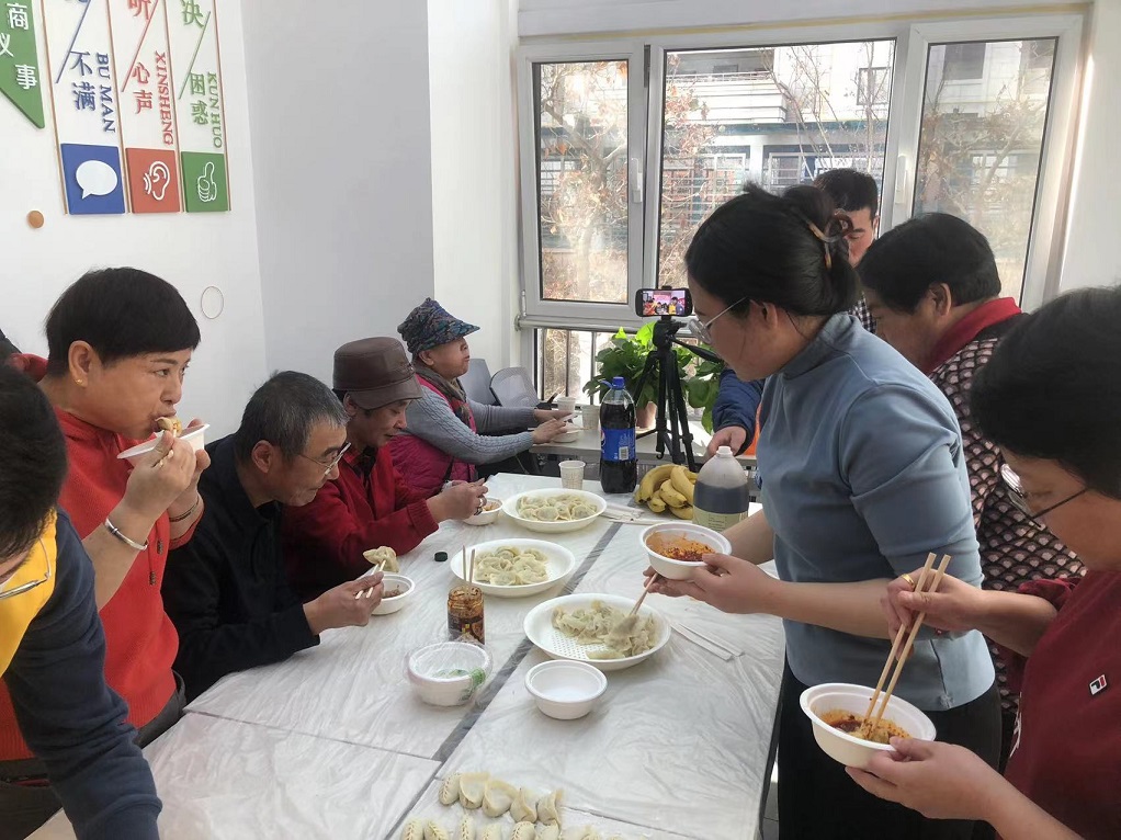 活動(dòng)中,11名居民群眾、社區(qū)工作人員和集團(tuán)公司志愿者們一起切菜剁餡,一起包餃子、煮餃子,忙得不亦樂乎。當(dāng)熱騰騰的餃子端上桌,大家圍桌而坐,共享香噴噴的餃子,感受著濃厚的節(jié)日氛圍。