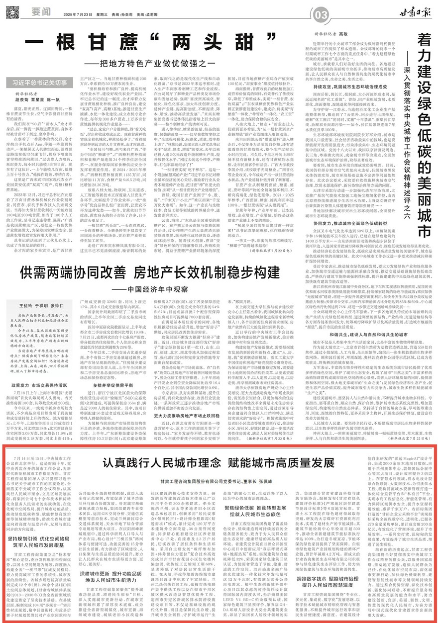 7月14日至15日,中央城市工作會議在北京舉行。這是時(shí)隔十年,黨中央再次召開的城市工作會議,為新時(shí)代新征程城市工作指明方向。甘肅工程咨詢集團(tuán)深入學(xué)習(xí)貫徹習(xí)近平總書記關(guān)于城市工作的重要論述,全面落實(shí)中央城市工作會議精神,認(rèn)真踐行人民城市理念,立足區(qū)域發(fā)展實(shí)際,將集團(tuán)公司七十余年技術(shù)積淀轉(zhuǎn)化為服務(wù)人民需求的實(shí)踐動能,在優(yōu)化城市空間格局、提升城市功能品質(zhì)、推動綠色低碳轉(zhuǎn)型、賦能智慧高效治理等領(lǐng)域精耕細(xì)作,助推全省城市建設(shè)向著高度與溫度并存、發(fā)展與惠民同步的方向邁進(jìn)。