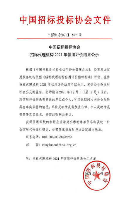 近日,在中國招標投標協(xié)會牽頭組織的2021年招標代理機構級信用評價認證工作中,經(jīng)中招協(xié)委托的第三方信用服務機構(國資委)商業(yè)信用中心及有關行業(yè)專家評審,招標咨詢集團子公司甘肅省招標中心有限公司和甘肅金安建設工程項目管理有限公司獲得2021年招標代理機構AAA級信用評價最高等級認證。