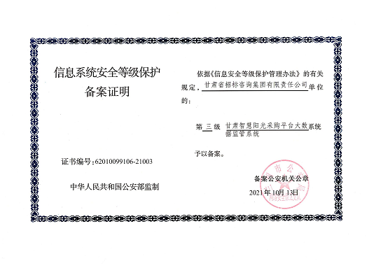 甘肅智慧陽(yáng)光采購(gòu)平臺(tái)“六大系統(tǒng)”于2021年10月13日完成定級(jí)、備案,近期完成安全建設(shè)和整改、信息安全等級(jí)測(cè)評(píng)、信息安全檢查,順利通過(guò)國(guó)家三級(jí)等保認(rèn)證,使平臺(tái)系統(tǒng)具有完善的防火墻、入侵檢測(cè)、數(shù)據(jù)加密以及災(zāi)難恢復(fù)等網(wǎng)絡(luò)安全設(shè)施和管理制度。
