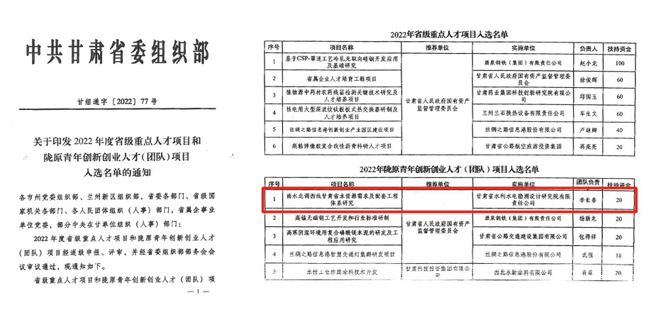 近日,省委組織部印發(fā)了《2022年度省級重點人才項目和隴原青年創(chuàng)新創(chuàng)業(yè)人才(團隊)項目入選名單》,甘肅省水利水電勘測設計研究院有限責任公司申報的《南水北調(diào)西線甘肅省水資源需求及配套工程體系研究》成功入選“2022年隴原青年創(chuàng)新創(chuàng)業(yè)人才(團隊)項目”,是集團公司唯一入選項目。