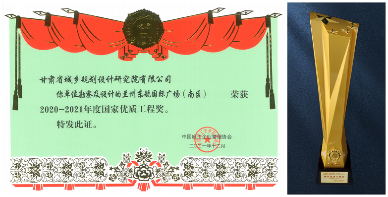 甘肅省城鄉(xiāng)規(guī)劃設(shè)計(jì)研究院勘察、設(shè)計(jì)的“蘭州東航國際廣場(南區(qū))項(xiàng)目”榮獲“2020—2021年度國家優(yōu)質(zhì)工程獎”。此前,該項(xiàng)目已榮獲2020年工程建設(shè)項(xiàng)目綠色建造設(shè)計(jì)水平評價(jià)三等成果、2020年度甘肅省優(yōu)秀工程勘察設(shè)計(jì)三等獎等多項(xiàng)榮譽(yù)。