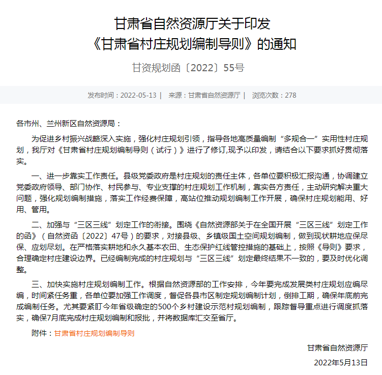 2022年3月以來(lái),在全面總結(jié)我省村莊規(guī)劃編制經(jīng)驗(yàn)的基礎(chǔ)上,省自然資源廳組織規(guī)劃設(shè)計(jì)院等14家規(guī)劃研究機(jī)構(gòu),堅(jiān)持“整體穩(wěn)定、局部微調(diào)、完善提升”的原則,對(duì)《甘肅省村莊規(guī)劃編制導(dǎo)則(試行)》進(jìn)行了修訂,重點(diǎn)將《導(dǎo)則》試行以來(lái)國(guó)家、我省對(duì)村莊規(guī)劃編制的新要求、新政策,以及村莊規(guī)劃試點(diǎn)工作中值得推廣的經(jīng)驗(yàn)方法融入其中,指導(dǎo)地方精準(zhǔn)化編規(guī)劃、差異化編規(guī)劃、用管結(jié)合編規(guī)劃、多方參與編規(guī)劃、精簡(jiǎn)結(jié)合編制規(guī)劃。