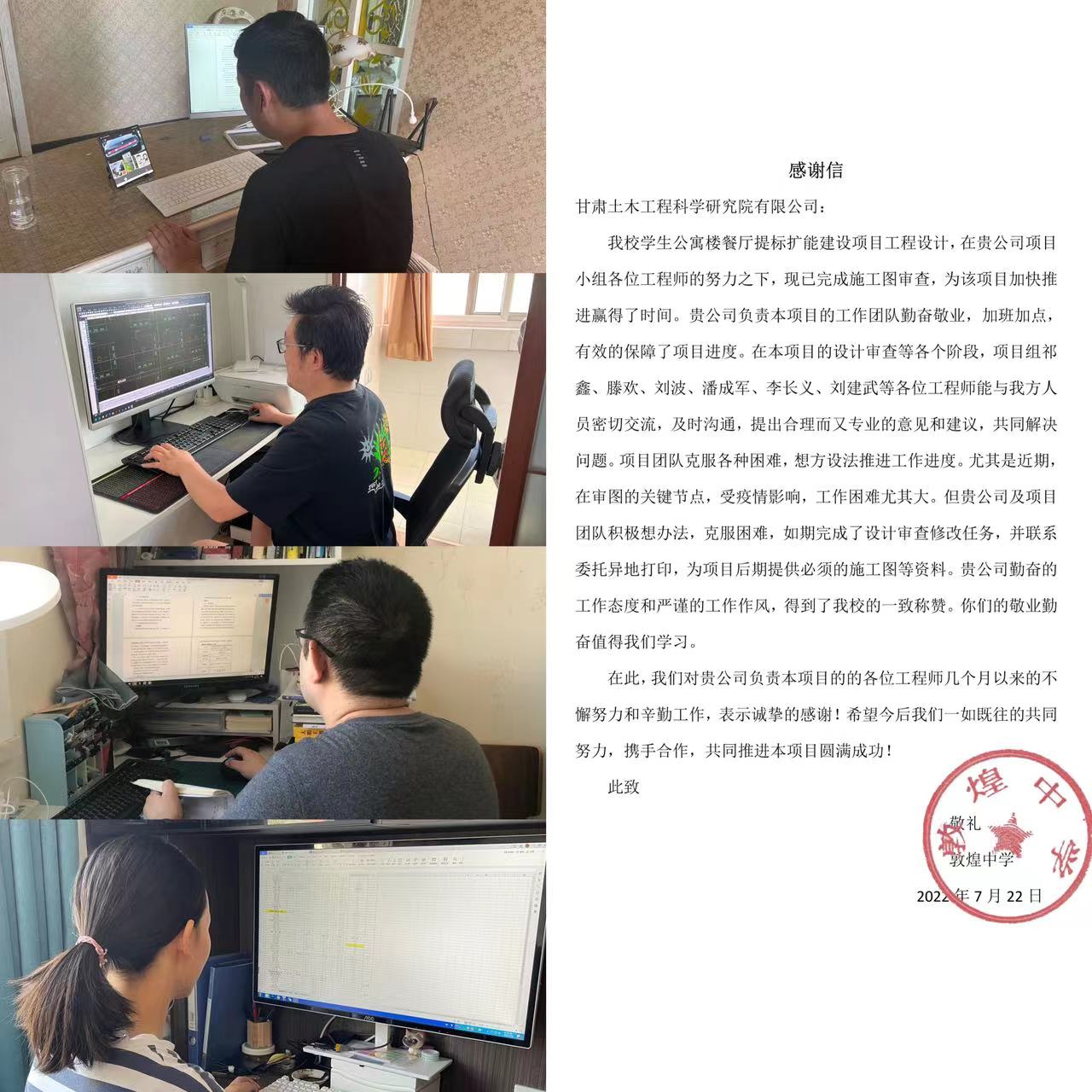 設(shè)計(jì)一所堅(jiān)決貫徹土木工程院黨委要求,第一時(shí)間部署疫情防控工作。在部門職工居家辦公期間,積極與軟件公司溝通協(xié)調(diào),為所有設(shè)計(jì)軟件增加了在線使用版,并利用釘釘、微信進(jìn)行線上溝通,疫情期間完成了2022年華亭市安口鎮(zhèn)老舊小區(qū)住宅樓棚戶區(qū)改造項(xiàng)目施工圖審查、甘肅武威工業(yè)園區(qū)天馬資源開(kāi)發(fā)有限公司鋼結(jié)構(gòu)標(biāo)準(zhǔn)化廠房建設(shè)項(xiàng)目、敦煌中學(xué)學(xué)生公寓樓餐廳提標(biāo)擴(kuò)能建設(shè)等項(xiàng)目,得到建設(shè)單位的一致好評(píng)和致信感謝,極大提升了部門員工技術(shù)創(chuàng)新、全方位服務(wù)的工作熱情。
