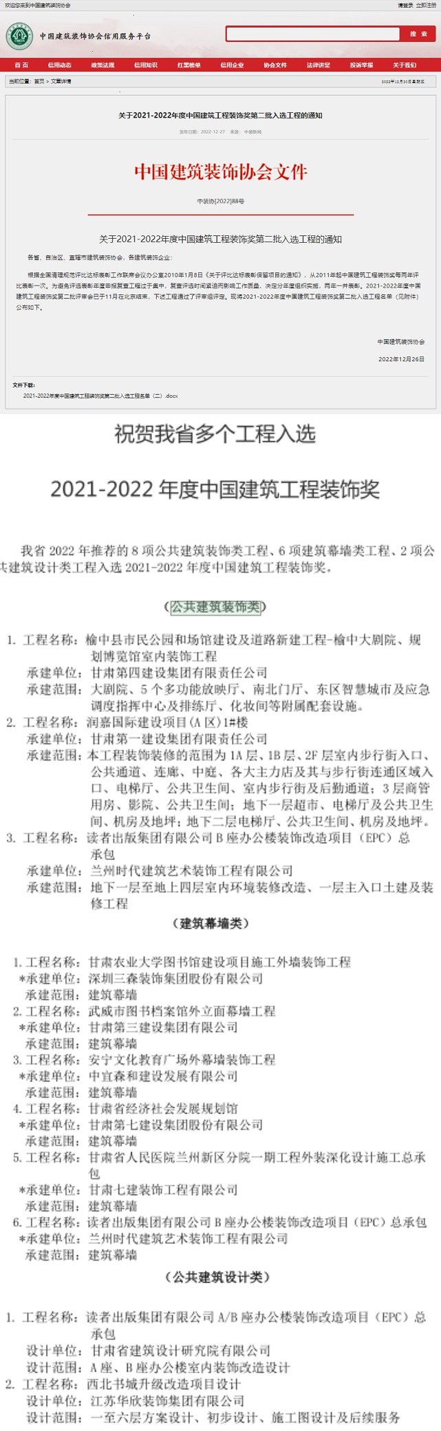 日前,2022年中國建筑工程裝飾獎評選結(jié)果揭曉,甘肅省建筑設(shè)計研究院有限公司多個項目榜上有名。其中,“甘肅省建筑設(shè)計研究院有限公司辦公樓消防改造及辦公環(huán)境提升改造項目”榮獲公共建筑裝飾類獎項;“讀者出版集團有限公司A/B座辦公樓裝飾改造項目”分別榮獲建筑幕墻類、公共建筑裝飾類和公共建筑設(shè)計類3項獎項。值得一提的是,建筑設(shè)計院子公司蘭州時代建筑藝術(shù)裝飾工程有限公司在此次獲獎中接連斬獲了3個獎項。截至目前,該公司已經(jīng)累計獲得7項中國建筑工程裝飾獎獎項。