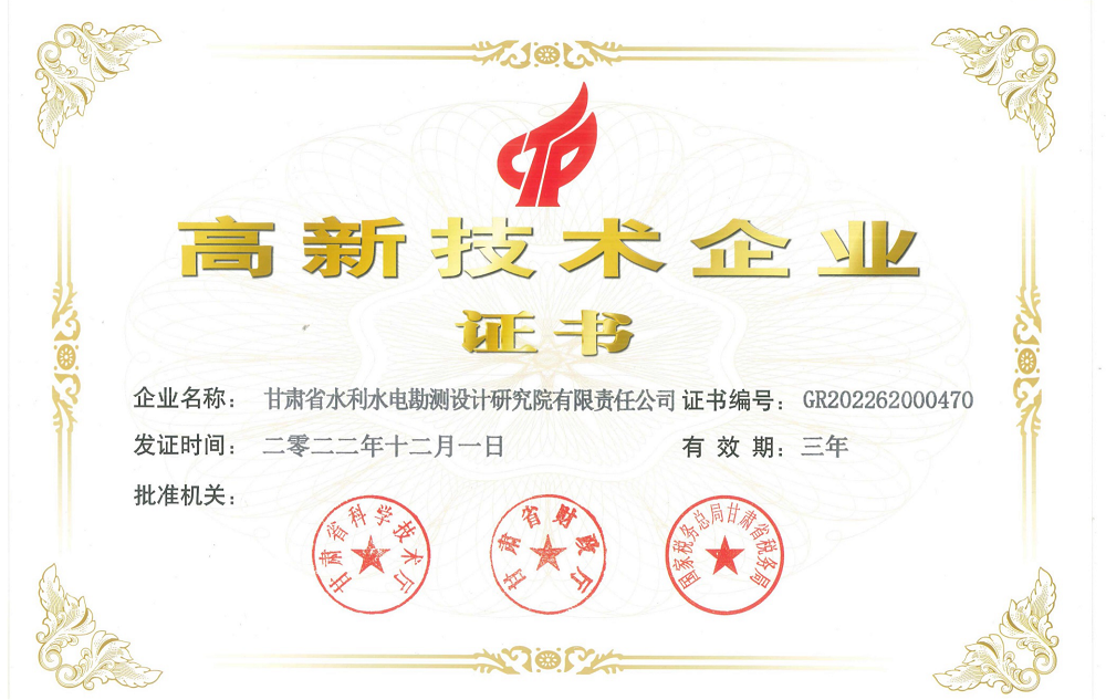 日前,甘肅省水利水電勘測(cè)設(shè)計(jì)研究院有限責(zé)任公司獲得甘肅省科技廳、甘肅省財(cái)政廳、國(guó)家稅務(wù)總局甘肅省稅務(wù)局聯(lián)合頒發(fā)的“高新技術(shù)企業(yè)證書(shū)”(證書(shū)編號(hào):GR202262000470),標(biāo)志著水電設(shè)計(jì)院正式邁入國(guó)家高新技術(shù)企業(yè)行列,是企業(yè)發(fā)展的又一個(gè)重要里程碑。