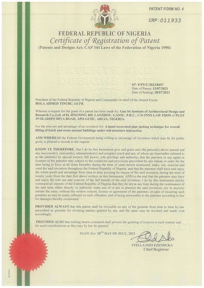 日前,非盟知識產(chǎn)權(quán)局對省建筑設(shè)計(jì)院王江龍等申報的“土-結(jié)構(gòu)相互作用下磚石結(jié)構(gòu)古建筑整體頂升手掘式頂管技術(shù)”(A hand-excavated pipe jacking technique for overall lifting of brick and stone ancient buildings under soil-structure interaction)進(jìn)行授權(quán),為省建筑設(shè)計(jì)院后續(xù)承接援外項(xiàng)目及國外項(xiàng)目給予了堅(jiān)實(shí)的技術(shù)支撐。