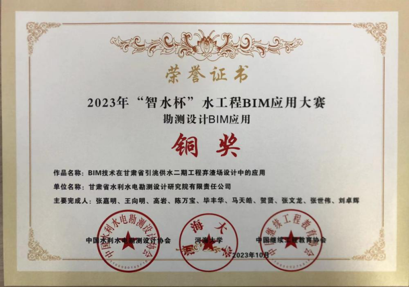 近日,中國水利水電勘測設計協會發(fā)布了2023年“智水杯”水工程BIM應用大賽獲獎項目,省水電設計院申報的《BIM技術在甘肅省引洮供水二期工程棄渣場設計中的應用》獲得勘測設計MIM應用銅獎。