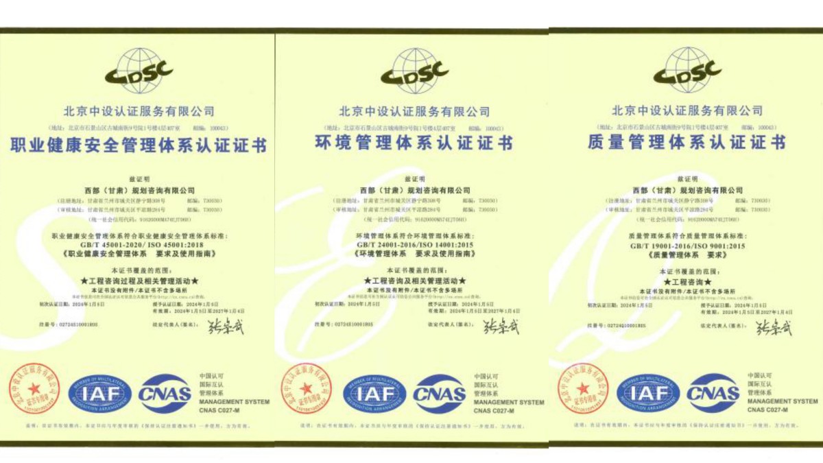近日,經(jīng)北京中設(shè)認證服務(wù)有限公司評審,西部(甘肅)規(guī)劃咨詢有限公司順利通過ISO9001質(zhì)量管理體系、ISO14001環(huán)境管理體系、ISO45001職業(yè)健康安全管理體系認證并取得證書。