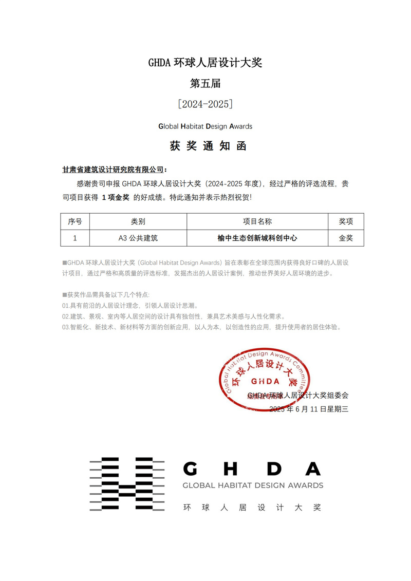 近日,備受矚目的第五屆GHDA環(huán)球人居設(shè)計(jì)大獎(jiǎng)獲獎(jiǎng)名單揭曉。甘肅工程咨詢集團(tuán)旗下省建筑設(shè)計(jì)院精心打造的榆中生態(tài)創(chuàng)新城科創(chuàng)中心項(xiàng)目,繼榮獲美國(guó)綠色建筑委員會(huì)頒發(fā)的LEED V4 BD+C鉑金級(jí)預(yù)認(rèn)證、中國(guó)綠色建筑三星級(jí)預(yù)評(píng)價(jià)兩項(xiàng)權(quán)威認(rèn)證后,再度摘得公共建筑類金獎(jiǎng),彰顯出我省在人居設(shè)計(jì)領(lǐng)域的卓越實(shí)力。